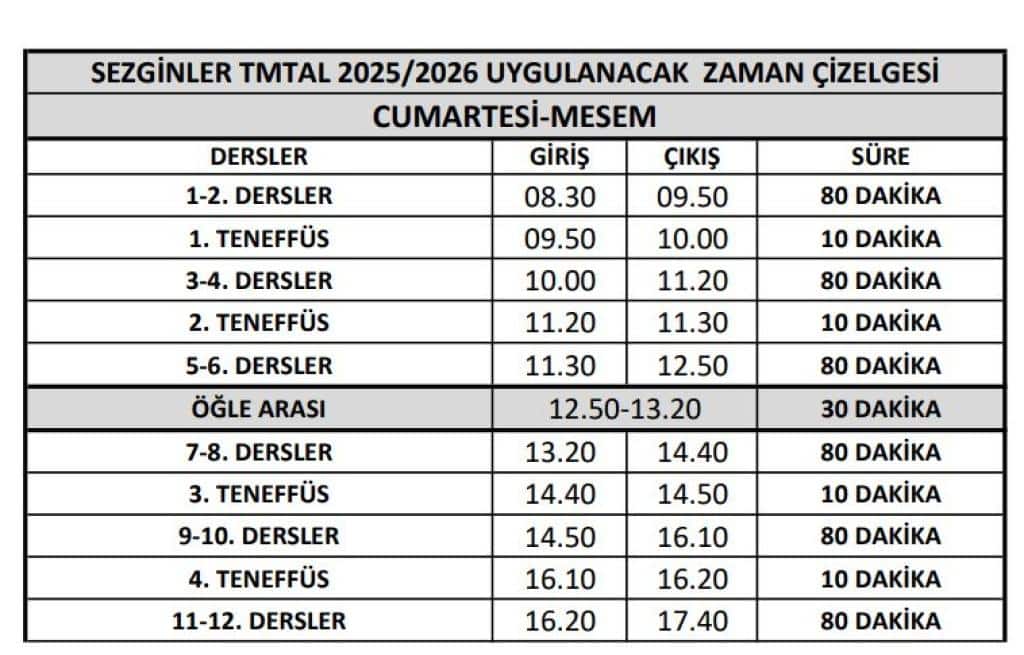 Okulumuz Mesleki Eğitim Programı Dersleri 2025 -2026 Eğitim Öğretim Yılında Cumartesi Günleri Yapılacaktır.